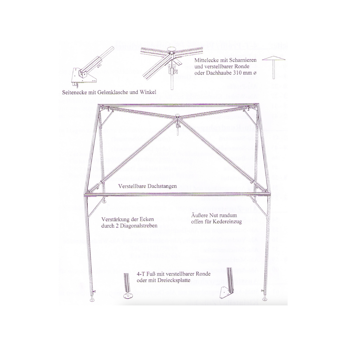 - Drei Seitenwände mit Fuß-Spannrohren 28/25 × 1 mm zur Abspannung